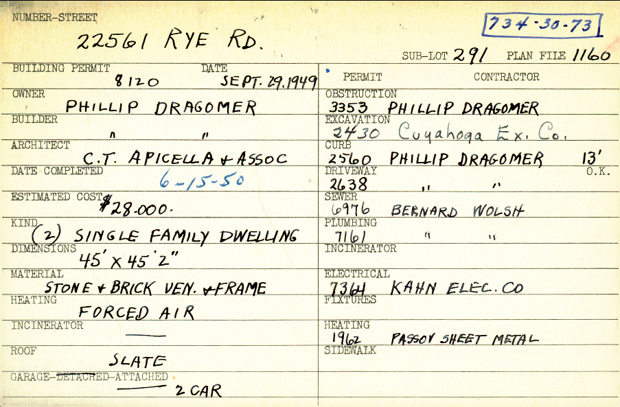 22561 Rye Road Shaker Heights, OH 44122 PARCEL ID: 734-30-073 Building Permit Date: 09-29-1949 Plan File Number: 1160 all scanned Microfilm Roll: Roll014 Neighborhood: Mercer Owner: Dragomer, Phillip Builder: Dragomer, Phillip Architect: C. T. Apicella and Associates Estimated Cost: 28000 Date Completed: 06-15-1950 Kind: Single, Single Residence or Dwelling (2) Material: Stone and Brick Veneer and Frame Heating: Forced Air Roof: Slate Garage: attached 2 car |