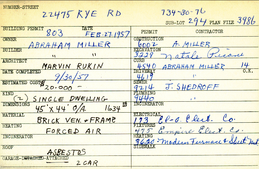 22475 Rye Road Shaker Heights, OH 44122 PARCEL ID: 734-30-076 Building Permit Date: 02-27-1957 Plan File Number: 3986 Microfilm Roll: Roll#58 Neighborhood: Mercer Owner: Miller, Abraham Builder: Miller, Abraham Architect: Rukin, Marvin Estimated Cost: 20000 Date Completed: 09-30-1957 Kind: Single, Single Residence or Dwelling (2) Material: Brick Veneer and Frame Heating: Forced Air Roof: Asbestos Garage: attached 2 car |