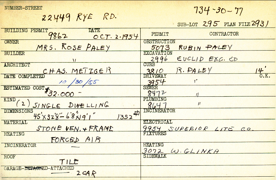 22449 Rye Road Shaker Heights, OH 44122 PARCEL ID: 734-30-077 Building Permit Date: 10-02-1954 Plan File Number: 2931, 7010, 11301 Microfilm Roll: Roll#42, Roll#50, Roll#90, NewRoll#7 Neighborhood: Mercer Owner: Paley, Mrs. Rose Builder: Paley, Mrs. Rose Architect: Metzger, Charles A. Estimated Cost: 32000 Date Completed: 10-30-1955 Kind: Single, Single Residence or Dwelling (2) Material: Stone Veneer and Frame Heating: Forced Air Roof: Tile Garage: attached 2 car |