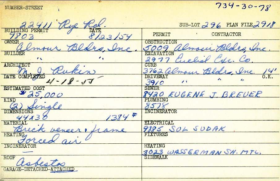 22411 Rye Road Shaker Heights, OH 44122 PARCEL ID: 734-30-078 Building Permit Date: 08-23-1954 Plan File Number: 2918 scanned, 12034 Microfilm Roll: Roll041, NewRoll#10 Neighborhood: Mercer Owner: Almour Builders Inc. Builder: Almour Builders Inc. Architect: Rukin, M. J. Estimated Cost: 25000 Date Completed: 04-18-1955 Kind: Single, Single Residence or Dwelling (2) Material: Brick Veneer and Frame Heating: Forced Air Roof: Asbestos Garage: attached |