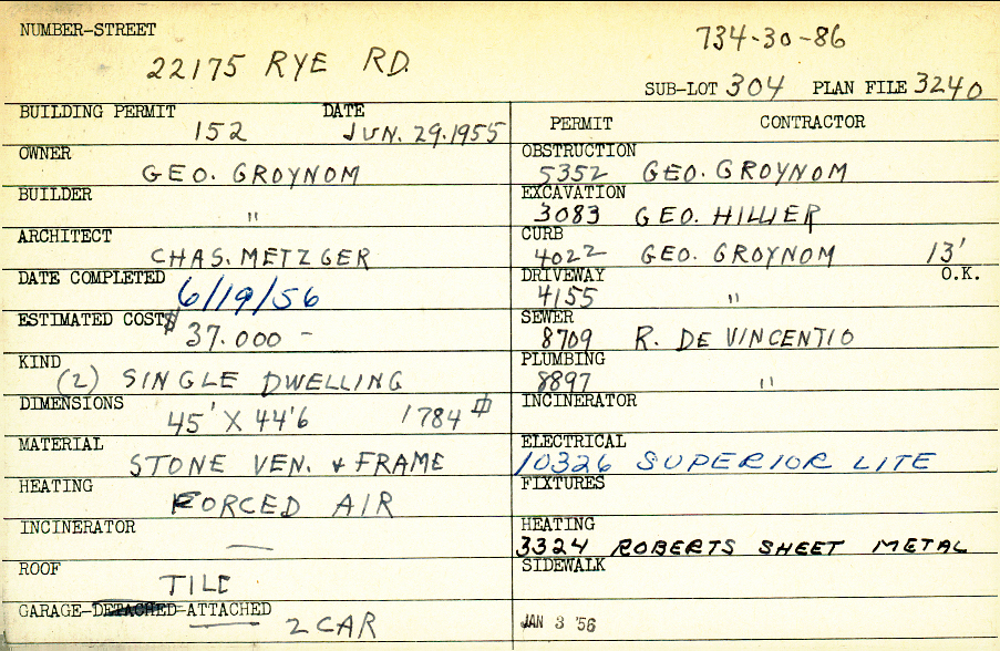 22175 Rye Road Shaker Heights, OH 44122 PARCEL ID: 734-30-086 Building Permit Date: 06-29-1955 Plan File Number: 3240 Microfilm Roll: Roll#47 Neighborhood: Mercer Owner: Groynom, George Builder: Groynom, George Architect: Metzger, Charles A. Estimated Cost: 37000 Date Completed: 06-19-1956 Kind: Single, Single Residence or Dwelling (2) Material: Stone Veneer and Frame Heating: Forced Air Roof: Tile Garage: attached 2 car |