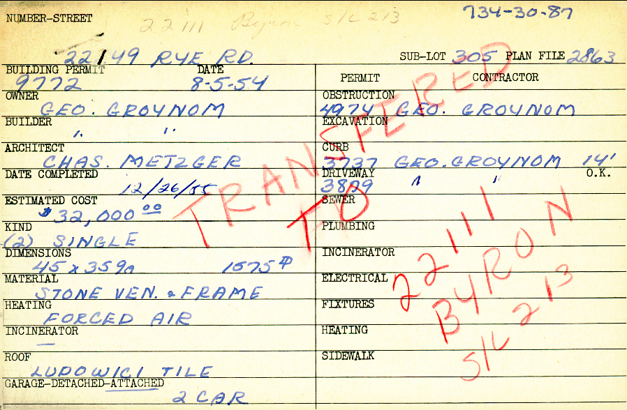 22149 Rye Road Shaker Heights, OH 44122 PARCEL ID: 734-30-087 Building Permit Date: 08-05-1954 Plan File Number: 2863, 3083 Microfilm Roll: Roll#43 Neighborhood: Mercer Owner: Groynom, George Builder: Groynom, George Architect: Metzger, Charles A. Estimated Cost: 32000 Date Completed: 12-26-1955 Kind: Single, Single Residence or Dwelling (2) Material: Stone Veneer and Frame Heating: Forced Air Roof: Tile Garage: attached 2 car |