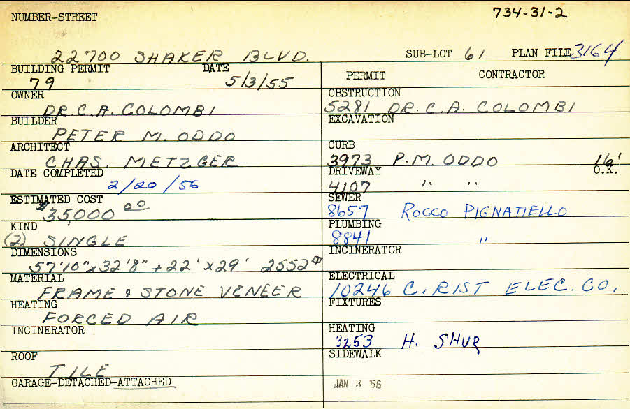 22700 Shaker Boulevard Shaker Heights, OH 44122 PARCEL ID: 734-31-002 Building Permit Date: 05-03-1955 Plan File Number: 3164 Microfilm Roll: Roll#44 Owner: Colombi, Dr. C. A. Builder: Oddo, Peter M. Architect: Metzger, Charles A. Estimated Cost: 35000 Date Completed: 02-20-1956 Kind: Single, Single Residence or Dwelling (2) Material: Frame and Stone Veneer Heating: Forced Air Roof: Tile Garage: attached |
