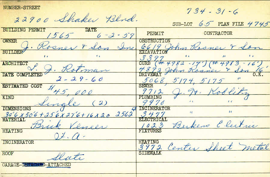 22900 Shaker Boulevard Shaker Heights, OH 44122 PARCEL ID: 734-31-006 Building Permit Date: 06-02-1959 Plan File Number: 4745 Microfilm Roll: Roll#66 Neighborhood: Mercer Owner: J. Rosner and Son, Inc. Builder: J. Rosner and Son, Inc. Architect: Rotman, L. J. Estimated Cost: 45000 Date Completed: 02-29-1960 Kind: Single, Single Residence or Dwelling (2) Material: Brick Veneer Heating: Forced Air Roof: Slate Garage: attached |