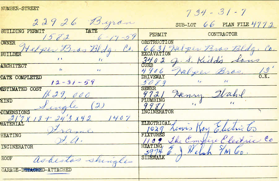 22926 Byron Road Shaker Heights, OH 44122 PARCEL ID: 734-31-007 Building Permit Date: 06-17-1959 Plan File Number: 4772 Microfilm Roll: Roll#66 Neighborhood: Mercer Owner: Helper Brothers Building Company Builder: Helper Brothers Building Company Architect: Helper Brothers Building Company Estimated Cost: 29000 Date Completed: 12-31-1959 Kind: Single, Single Residence or Dwelling (2) Material: Frame Heating: Forced Air Roof: Asbestos Shingles Garage: attached |