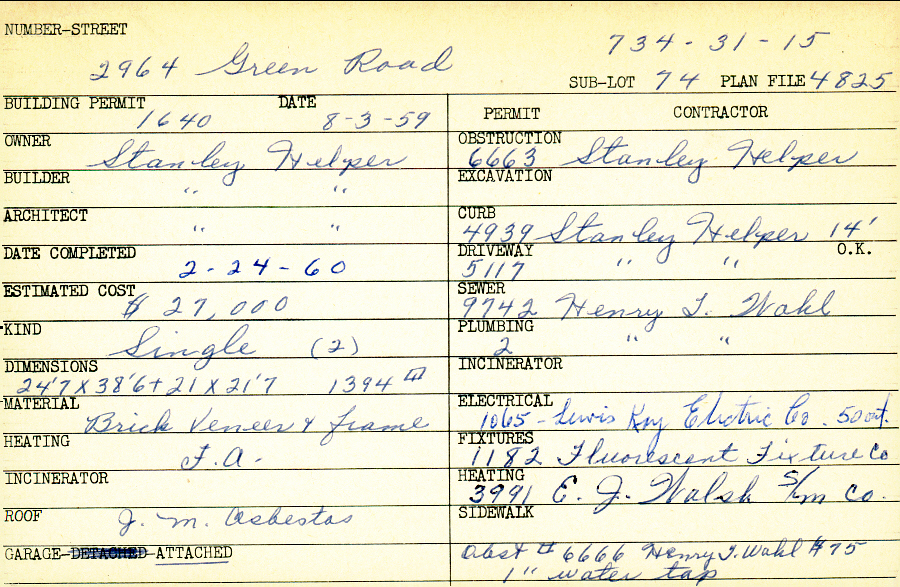 2964 Green Road Shaker Heights, OH 44122 PARCEL ID: 734-31-015 Building Permit Date: 08-03-1959 Plan File Number: 4825 Microfilm Roll: Roll#66 Neighborhood: Mercer Owner: Helper, Stanley Builder: Helper, Stanley Architect: Helper, Stanley Estimated Cost: 27000 Date Completed: 02-24-1960 Kind: Single, Single Residence or Dwelling (2) Material: Brick Veneer and Frame Heating: Forced Air Roof: Asbestos Garage: attached |