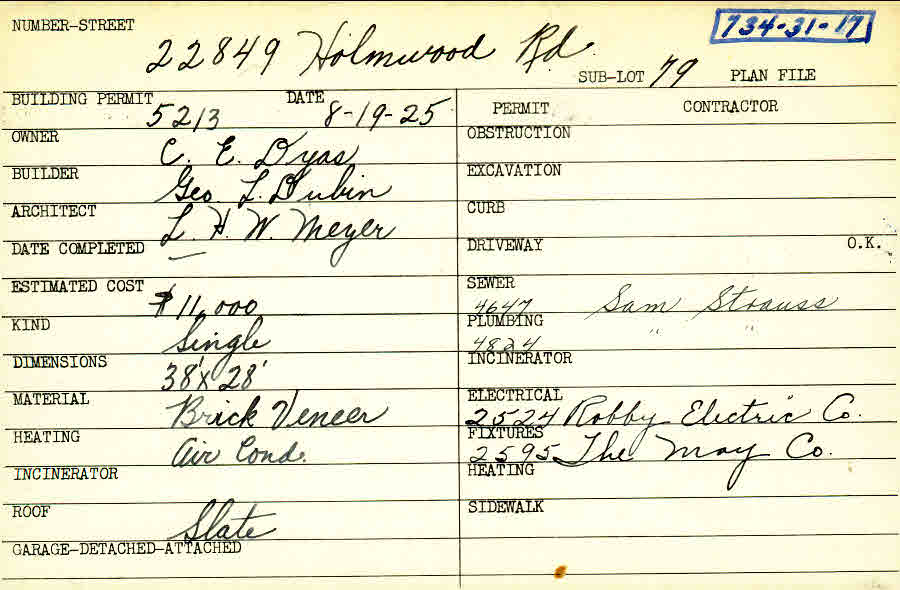 22849 Holmwood Road Shaker Heights, OH 44122 PARCEL ID: 734-31-017 Building Permit Date: 08-19-1925 Plan File Number: 0 Neighborhood: Mercer Owner: Dyas, C. E. Builder: Dubin, George L. Architect: Meyer, L. H. W. Estimated Cost: 11000 Kind: Single, Single Residence or Dwelling Material: Brick Veneer Heating: Air Conditioned Roof: Slate Card Available: yes |