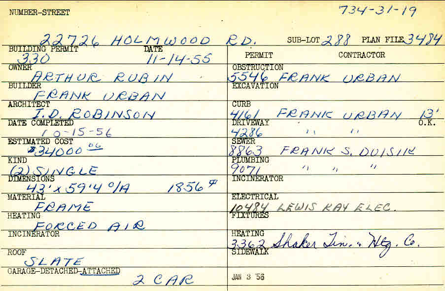 22726 Holmwood Road Shaker Heights, OH 44122 PARCEL ID: 734-31-019 Building Permit Date: 11-14-1955 Plan File Number: 3484, 5810 Microfilm Roll: Roll#51, Roll#78 Neighborhood: Mercer Owner: Rubin, Arthur Builder: Urban, Frank Architect: Robinson, I. D. Estimated Cost: 34000 Date Completed: 10-15-1956 Kind: Single, Single Residence or Dwelling (2) Material: Frame Heating: Forced Air Roof: Slate Garage: attached 2 car |