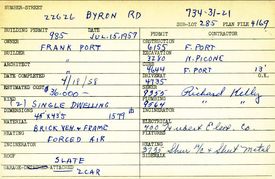 22626 Byron Road Shaker Heights, OH 44122 PARCEL ID: 734-31-021 Building Permit Date: 07-15-1957 Plan File Number: 4169 Microfilm Roll: Roll#61 Neighborhood: Mercer Owner: Port, Frank Builder: Port, Frank Architect: Port, Frank Estimated Cost: 36000 Date Completed: 04-18-1958 Kind: Single, Single Residence or Dwelling (2) Material: Brick Veneer and Frame Heating: Forced Air Roof: Slate Garage: attached 2 car |