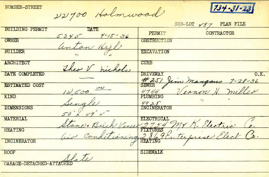 22700 Holmwood Road Shaker Heights, OH 44122 PARCEL ID: 734-31-023 Building Permit Date: 04-18-1936 Plan File Number: 6801 Microfilm Roll: Roll#88 Neighborhood: Mercer Owner: Hejl, Anton Builder: Hejl, Anton Architect: Nichols, Theodore V. Estimated Cost: 12500 Kind: Single, Single Residence or Dwelling Material: Stone and Brick Veneer Heating: Air Conditioned Roof: Slate |