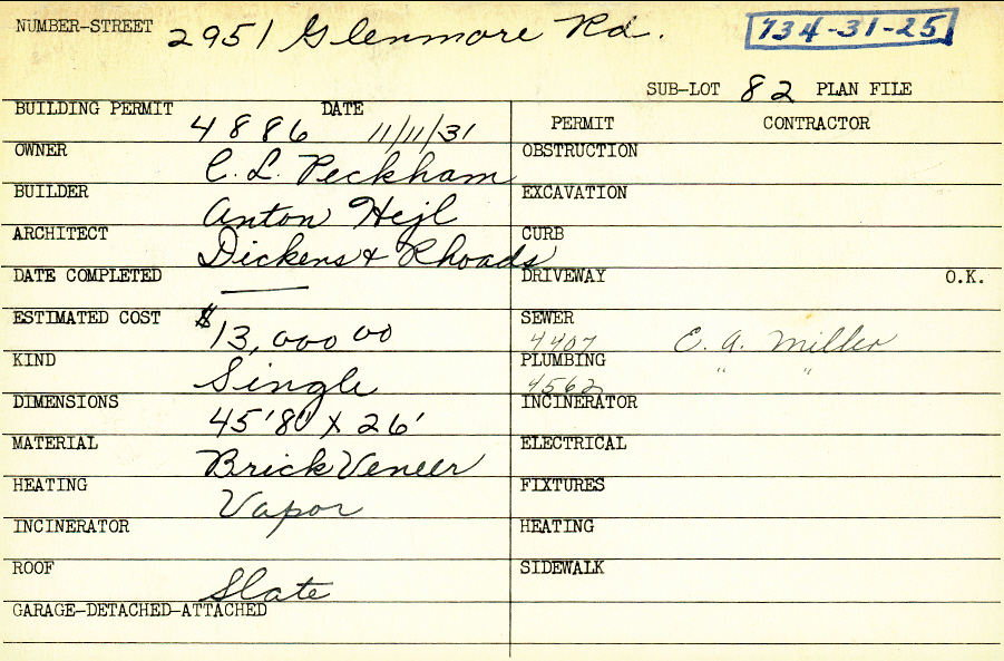 2951 Glenmore Road Shaker Heights, OH 44122 PARCEL ID: 734-31-025 Building Permit Date: 11-11-1931 Plan File Number: 0 Neighborhood: Mercer Owner: Peckham, C. L. Builder: Hejl, Anton Architect: Dickens and Rhoads Estimated Cost: 13000 Kind: Single, Single Residence or Dwelling Material: Brick Veneer Heating: Vapor Roof: Slate Card Available: yes |