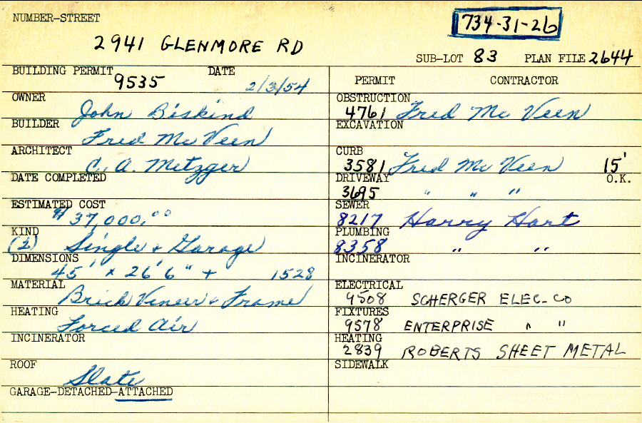 2941 Glenmore Road Shaker Heights, OH 44122 PARCEL ID: 734-31-026 Building Permit Date: 02-03-1954 Plan File Number: 2644 Microfilm Roll: Roll #37 Neighborhood: Mercer Owner: Biskind, John Builder: McVeen, Fred Architect: Metzger, C. A. Estimated Cost: 37000 Kind: Single Dwelling and Garage (2) Material: Brick Veneer and Frame Heating: Forced Air Roof: Slate Garage: attached |
