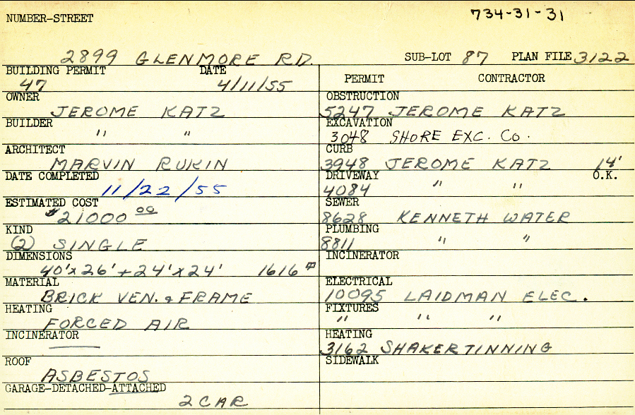 2899 Glenmore Road Shaker Heights, OH 44122 PARCEL ID: 734-31-031 Building Permit Date: 04-11-1955 Plan File Number: 3122 Microfilm Roll: Roll#43 Neighborhood: Mercer Owner: Katz, Jerome Builder: Katz, Jerome Architect: Rukin, Marvin Estimated Cost: 21000 Date Completed: 11-22-1955 Kind: Single, Single Residence or Dwelling (2) Material: Brick Veneer and Frame Heating: Forced Air Roof: Asbestos Garage: attached 2 car |