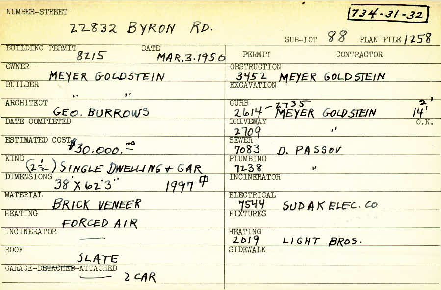 22832 Byron Road Shaker Heights, OH 44122 PARCEL ID: 734-31-032 Building Permit Date: 03-03-1950 Plan File Number: 1258 all scanned Microfilm Roll: Roll015 Neighborhood: Mercer Owner: Goldstein, Meyer Builder: Goldstein, Meyer Architect: Burrows, George Estimated Cost: 30000 Kind: Single 2-1/2 Material: Brick Veneer Heating: Forced Air Roof: Slate Garage: attached 2 car |