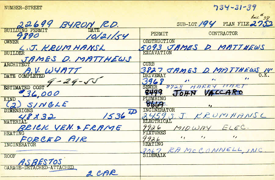 22699 Byron Road Shaker Heights, OH 44122 PARCEL ID: 734-31-039 Building Permit Date: 10-21-1954 Plan File Number: 2752 Microfilm Roll: Roll #38 Neighborhood: Mercer Owner: Krumhansl, L. J. Builder: Matthews, James D. Architect: Wyatt, A. V. Estimated Cost: 36000 Date Completed: 09-29-1955 Kind: Single, Single Residence or Dwelling (2) Material: Brick Veneer and Frame Heating: Forced Air Roof: Asbestos Garage: attached 2 car |