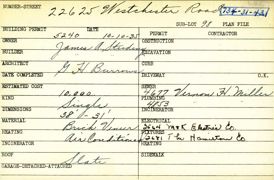 22625 Westchester Road Shaker Heights, OH 44122 PARCEL ID: 734-31-043 Building Permit Date: 10-10-1935 Plan File Number: 0 Neighborhood: Mercer Owner: Studeny, James A. Builder: Studeny, James A. Architect: Burrows, G. H. Estimated Cost: 10000 Kind: Single, Single Residence or Dwelling Material: Brick Veneer Heating: Air Conditioned Roof: Slate |