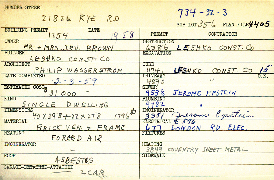 21826 Rye Road Shaker Heights, OH 44122 PARCEL ID: 734-32-003 Building Permit Date: 06-30-1958 Plan File Number: 4405 Microfilm Roll: Roll#63 Neighborhood: Mercer Owner: Brown, Mr. and Mrs. Irving Builder: Leshko Construction Company Architect: Wasserstrom, Philip Estimated Cost: 31000 Date Completed: 02-03-1959 Kind: Single, Single Residence or Dwelling Material: Brick Veneer and Frame Heating: Forced Air Roof: Asbestos Garage: attached 2 car |