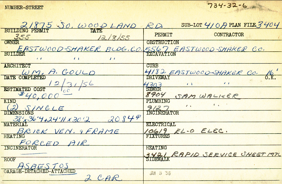 21875 South Woodland Road Shaker Heights, OH 44122 PARCEL ID: 734-32-006 Building Permit Date: 12-08-1955 Plan File Number: 3404 Microfilm Roll: Roll#50 Neighborhood: Mercer Owner: Eastwood-Shaker Building Company Builder: Eastwood-Shaker Building Company Architect: Gould, William A. Estimated Cost: 40000 Date Completed: 12-31-1956 Kind: Single, Single Residence or Dwelling (2) Material: Brick Veneer and Frame Heating: Forced Air Roof: Asbestos Garage: attached 2 car |