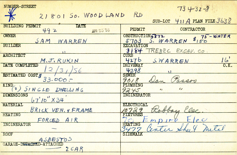 21801 South Woodland Road Shaker Heights, OH 44122 PARCEL ID: 734-32-008 Building Permit Date: 04-25-1956 Plan File Number: 3638, 3738 Microfilm Roll: Roll#54 Neighborhood: Mercer Owner: Warren, Sam Builder: Warren, Sam Architect: Rukin, M. J. Estimated Cost: 33000 Date Completed: 12-31-1956 Kind: Single, Single Residence or Dwelling (2) Material: Brick Veneer and Frame Heating: Forced Air Roof: Asbestos Garage: attached 2 car |