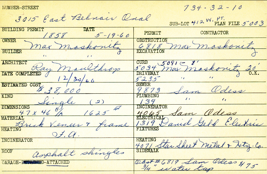 3015 East Belvoir Oval Shaker Heights, OH 44122 PARCEL ID: 734-32-010 Building Permit Date: 05-19-1960 Plan File Number: 5003 Microfilm Roll: Roll#69 Neighborhood: Mercer Owner: Moskovitz, Max Builder: Moskovitz, Max Architect: Moulthrop, Ray Estimated Cost: 38000 Date Completed: 12-30-1960 Kind: Single, Single Residence or Dwelling (2) Material: Brick Veneer and Frame Heating: Forced Air Roof: Asphalt Shingles Garage: attached |