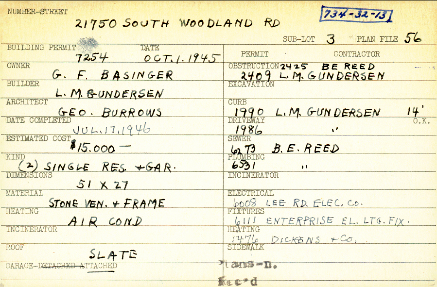 21750 South Woodland Road Shaker Heights, OH 44122 PARCEL ID: 734-32-013 Building Permit Date: 10-01-1945 Plan File Number: 56 all scanned Microfilm Roll: Roll001 Neighborhood: Mercer Owner: Basinger, G. F. Builder: Gundersen, L. M. Architect: Burrows, George Estimated Cost: 15000 Date Completed: 07-17-1946 Kind: Single Dwelling and Garage (2) Material: Stone Veneer and Frame Heating: Air Conditioned Roof: Slate Garage: attached |