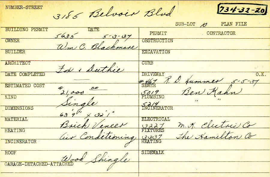 3185 Belvoir Boulevard Shaker Heights, OH 44122 PARCEL ID: 734-32-020 Building Permit Date: 05-03-1937 Plan File Number: 0 Neighborhood: Mercer Owner: Blackmore, William C. Architect: Fox and Duthie Estimated Cost: 21000 Kind: Single, Single Residence or Dwelling Material: Brick Veneer Heating: Air Conditioned Roof: Wood Shingle |