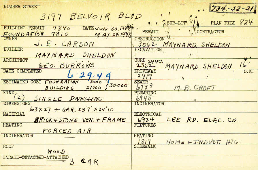 3197 Belvoir Boulevard Shaker Heights, OH 44122 PARCEL ID: 734-32-021 Building Permit Date: 05-24-1948 Plan File Number: 824 all scanned Microfilm Roll: Roll011 Neighborhood: Mercer Owner: Carson, J. E. Builder: Sheldon, Maynard Architect: Burrows, George Estimated Cost: 30000 Date Completed: 06-29-1949 Kind: Single, Single Residence or Dwelling (2) Material: Brick and Stone Veneer and Frame Heating: Forced Air Roof: Wood Garage: attached 3 car |