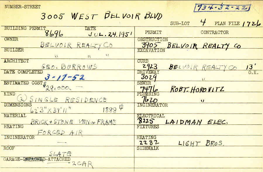 3005 West Belvoir Oval Shaker Heights, OH 44122 PARCEL ID: 734-32-022 Building Permit Date: 07-24-1951 Plan File Number: 1726, 4386 all scanned Microfilm Roll: Roll26A, Roll062 Neighborhood: Mercer Owner: Belvoir Realty Company Builder: Belvoir Realty Company Architect: Burrows, George Estimated Cost: 28000 Date Completed: 03-17-1952 Kind: Single, Single Residence or Dwelling (2) Material: Brick and Stone Veneer and Frame Heating: Forced Air Roof: Slate Garage: attached 2 car |