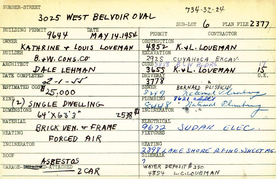 3025 West Belvoir Oval Shaker Heights, OH 44122 PARCEL ID: 734-32-024 Building Permit Date: 05-14-1954 Plan File Number: 1886 scanned, 2377 Microfilm Roll: Roll029, Roll#34 Neighborhood: Mercer Owner: Loveman, Kathrine and Louis Builder: B and W Construction Company Architect: Lehman, Dale Estimated Cost: 25000 Date Completed: 02-01-1955 Kind: Single, Single Residence or Dwelling (2) Material: Brick Veneer and Frame Heating: Forced Air Roof: Asbestos Garage: attached 2 car |