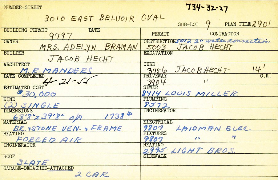 3010 East Belvoir Oval Shaker Heights, OH 44122 PARCEL ID: 734-32-027 Plan File Number: 2901 all scanned Microfilm Roll: Roll041 Neighborhood: Mercer Owner: Braman, Mrs. Adelyn Builder: Hecht, Jacob Architect: Manders, M. R. Estimated Cost: 30000 Date Completed: 04-21-1955 Kind: Single, Single Residence or Dwelling (2) Material: Brick and Stone Veneer and Frame Heating: Forced Air Roof: Slate Garage: attached 2 car |