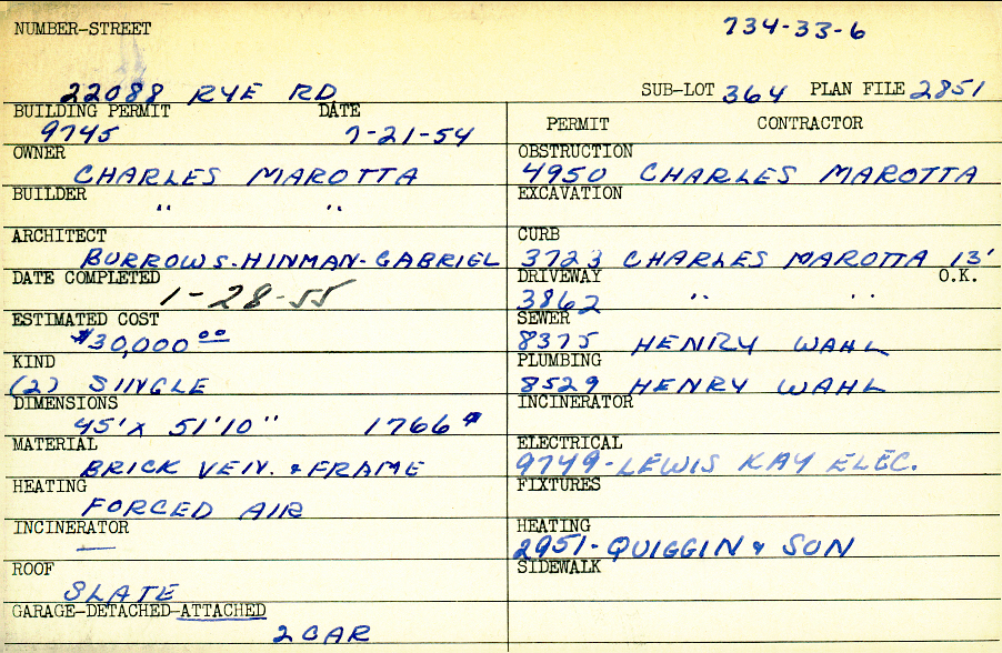 22088 Rye Road Shaker Heights, OH 44122 PARCEL ID: 734-33-006 Building Permit Date: 07-21-1954 Plan File Number: 2851 all scanned Microfilm Roll: Roll041 Neighborhood: Mercer Owner: Marotta, Charles Builder: Marotta, Charles Architect: Burrows, Hinman, Gabriel Estimated Cost: 30000 Date Completed: 01-28-1955 Kind: Single, Single Residence or Dwelling (2) Material: Brick Veneer and Frame Heating: Forced Air Roof: Slate Garage: attached 2 car |