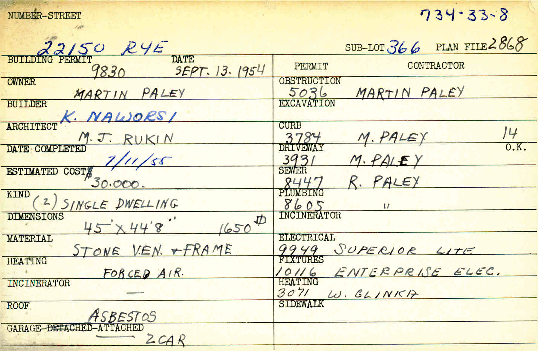 22150 Rye Road Shaker Heights, OH 44122 PARCEL ID: 734-33-008 Building Permit Date: 09-13-1954 Plan File Number: 2868 scanned Microfilm Roll: Roll041 Neighborhood: Mercer Owner: Paley, Martin Builder: Naworsi, K. Architect: Rukin, M. J. Estimated Cost: 30000 Date Completed: 07-11-1955 Kind: Single, Single Residence or Dwelling (2) Material: Stone Veneer & Frame Heating: Forced Air Roof: Asbestos Garage: attached 2 car Card Available: Yes |