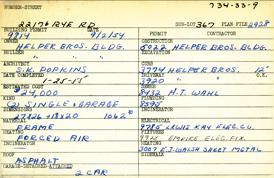 22176 Rye Road Shaker Heights, OH 44122 PARCEL ID: 734-33-009 Building Permit Date: 09-02-1954 Plan File Number: 2928 scanned, 6306 Microfilm Roll: Roll041, Roll#42, Roll#85 Neighborhood: Mercer Owner: Helper Brothers Building Builder: Helper Brothers Building Architect: Popkins, S. K. Estimated Cost: 24000 Date Completed: 01-25-1955 Kind: Single Dwelling and Garage (2) Material: Frame Heating: Forced Air Roof: Asphalt Garage: attached 2 car |
