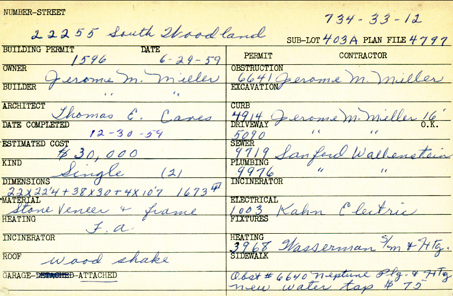 22255 South Woodland Road Shaker Heights, OH 44122 PARCEL ID: 734-33-012 Building Permit Date: 06-29-1959 Plan File Number: 4797 Microfilm Roll: Roll#66 Neighborhood: Mercer Owner: Miller, Jerome M. Builder: Miller, Jerome M. Architect: Caves, Thomas E. Estimated Cost: 30000 Date Completed: 12-30-1959 Kind: Single, Single Residence or Dwelling (2) Material: Stone Veneer and Frame Heating: Forced Air Roof: Wood Shakes Garage: attached |