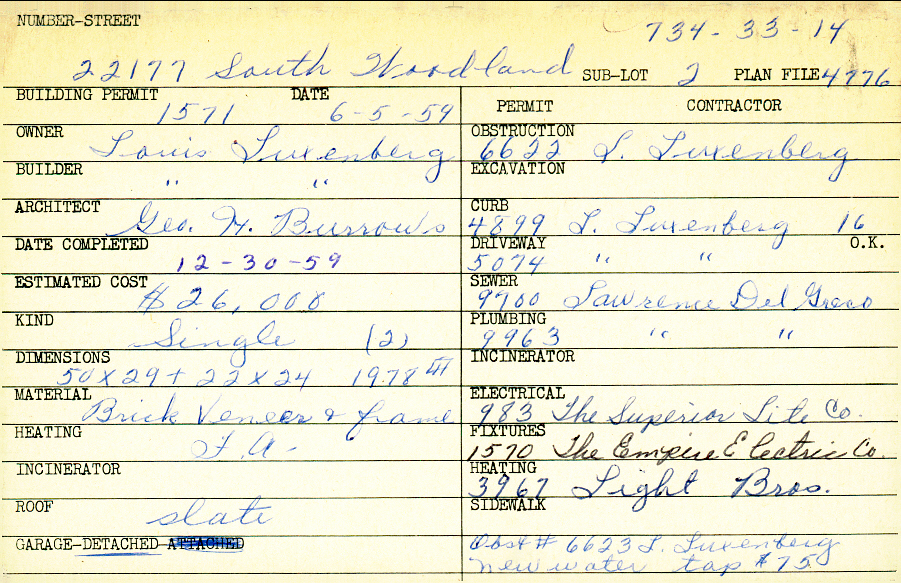 22177 South Woodland Road Shaker Heights, OH 44122 PARCEL ID: 734-33-014 Building Permit Date: 06-05-1959 Plan File Number: 4776 Microfilm Roll: Roll#66 Neighborhood: Mercer Owner: Luxenberg, Louis Builder: Luxenberg, Louis Architect: Burrows, George H. Estimated Cost: 26000 Date Completed: 12-30-1959 Kind: Single, Single Residence or Dwelling (2) Material: Brick Veneer and Frame Heating: Forced Air Roof: Slate Garage: detached |
