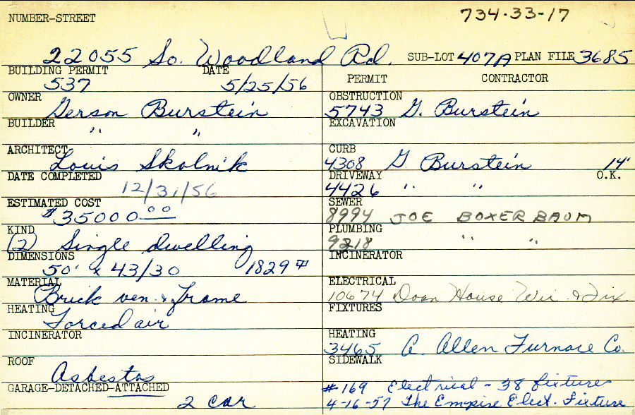 22055 South Woodland Road Shaker Heights, OH 44122 PARCEL ID: 734-33-017 Building Permit Date: 05-25-1956 Plan File Number: 3685 Microfilm Roll: Roll#55 Neighborhood: Mercer Owner: Burstein, Gerson Builder: Burstein, Gerson Architect: Skolnik, Louis Estimated Cost: 35000 Date Completed: 12-31-1956 Kind: Single, Single Residence or Dwelling (2) Material: Brick Veneer and Frame Heating: Forced Air Roof: Asbestos Garage: attached 2 car |