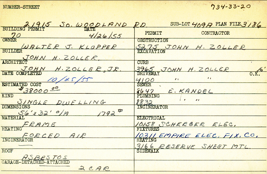 21915 South Woodland Road Shaker Heights, OH 44122 PARCEL ID: 734-33-020 Building Permit Date: 04-26-1955 Plan File Number: 3186 Microfilm Roll: Roll#44 Neighborhood: Mercer Owner: Klopper, Walter J. Builder: Zoller, John H. Architect: Zoller, John H. Estimated Cost: 38000 Date Completed: 10-25-1955 Kind: Single, Single Residence or Dwelling Material: Frame Heating: Forced Air Roof: Asbestos Garage: attached 2 car |