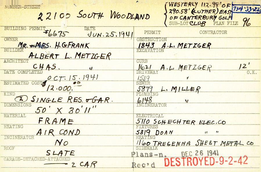 22100 South Woodland Road Shaker Heights, OH 44122 PARCEL ID: 734-33-022 Building Permit Date: 06-25-1941 Plan File Number: 96 Neighborhood: Mercer Owner: Frank, Mr. and Mrs. H. G. Builder: Metzger, Albert L. Architect: Metzger, Charles A. Estimated Cost: 12000 Date Completed: 10-15-1941 Kind: Single Dwelling and Garage (2) Material: Frame Heating: Air Conditioned Roof: Slate Garage: attached 2 car |