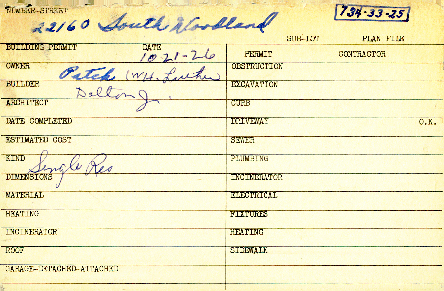22160 South Woodland Road Shaker Heights, OH 44122 PARCEL ID: 734-33-025 Building Permit Date: 10-21-1926 Plan File Number: 3896, 11424 Microfilm Roll: Roll#57, NewRoll#7 Neighborhood: Mercer Owner: Patch, W. H. Luther Builder: Dalton, Jr. Kind: Single, Single Residence or Dwelling |