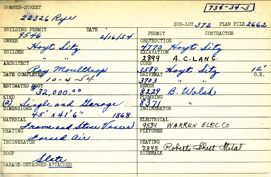22326 Rye Road Shaker Heights, OH 44122 PARCEL ID: 734-34-003 Building Permit Date: 02-16-1954 Plan File Number: 2662, 5304 Microfilm Roll: Roll #37, Roll#73 Neighborhood: Mercer Owner: Sitz, Hoyt Builder: Sitz, Hoyt Architect: Moulthrop, Ray Estimated Cost: 32000 Date Completed: 10-04-1954 Kind: Single Dwelling and Garage (2) Material: Frame and Stone Veneer Heating: Forced Air Roof: Slate Garage: attached |