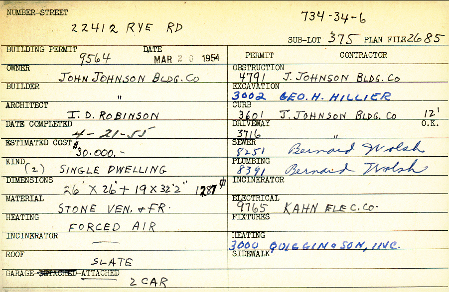 22412 Rye Road Shaker Heights, OH 44122 PARCEL ID: 734-34-006 Building Permit Date: 03-20-1954 Plan File Number: 2685 Microfilm Roll: Roll #37 Neighborhood: Mercer Owner: John Johnson Building Company Builder: John Johnson Building Company Architect: Robinson, I. D. Estimated Cost: 30000 Date Completed: 04-21-1955 Kind: Single, Single Residence or Dwelling (2) Material: Stone Veneer and Frame Heating: Forced Air Roof: Slate Garage: attached 2 car |