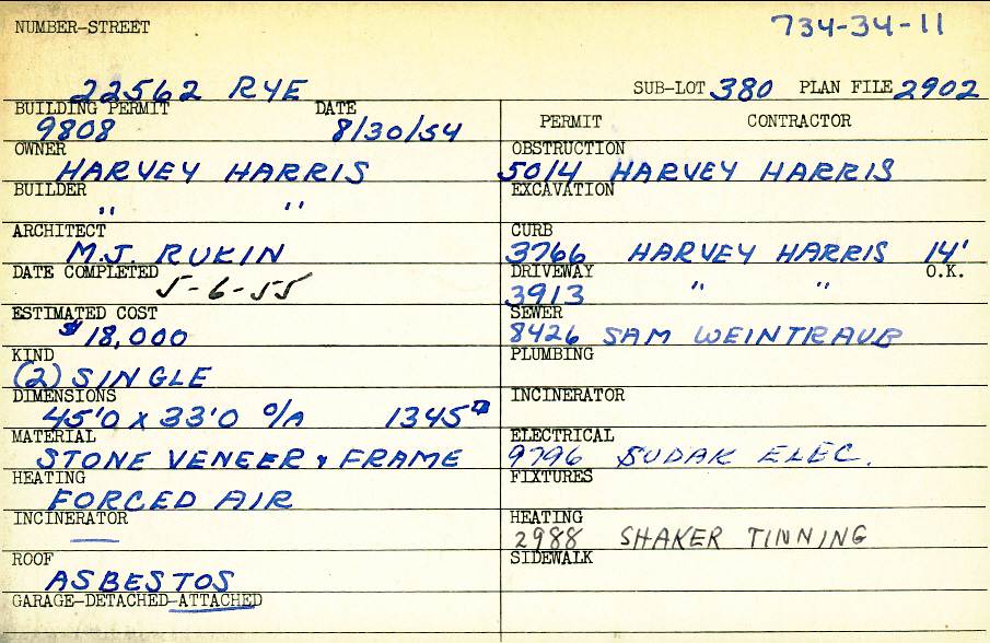 22562 Rye Road Shaker Heights, OH 44122 PARCEL ID: 734-34-011 Building Permit Date: 08-30-1954 Plan File Number: 2902 all scanned Microfilm Roll: Roll041 Neighborhood: Mercer Owner: Harris, Harvey Builder: Harris, Harvey Architect: Rukin, M. J. Estimated Cost: 18000 Date Completed: 05-06-1955 Kind: Single, Single Residence or Dwelling (2) Material: Stone Veneer and Frame Heating: Forced Air Roof: Asbestos Garage: attached |