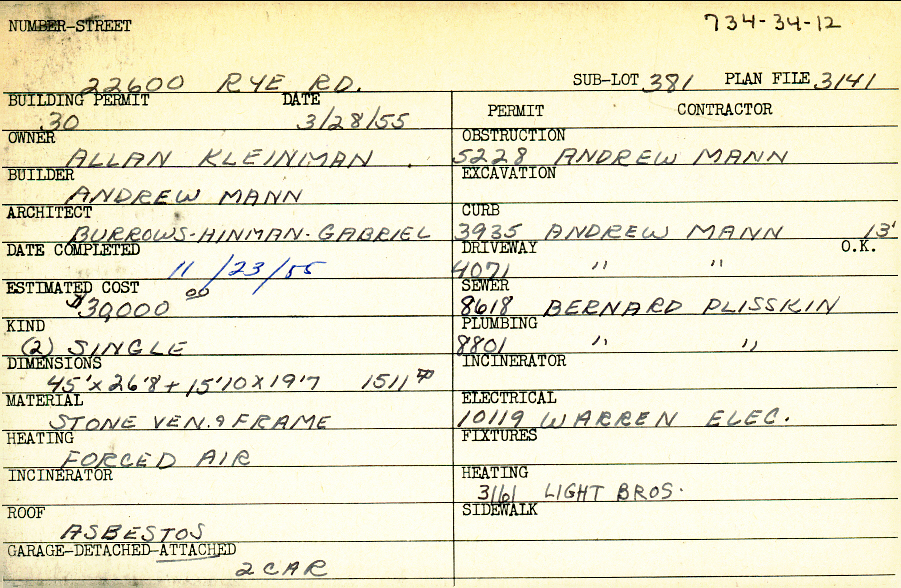 22600 Rye Road Shaker Heights, OH 44122 PARCEL ID: 734-34-012 Building Permit Date: 03-28-1955 Plan File Number: 3141, 6249 Microfilm Roll: Roll#44, Roll#84 Neighborhood: Mercer Owner: Kleinman, Allan Builder: Mann, Andrew Architect: Burrows, Hinman, Gabriel Estimated Cost: 30000 Date Completed: 11-23-1955 Kind: Single, Single Residence or Dwelling (2) Material: Stone Veneer and Frame Heating: Forced Air Roof: Asbestos Garage: attached 2 car |