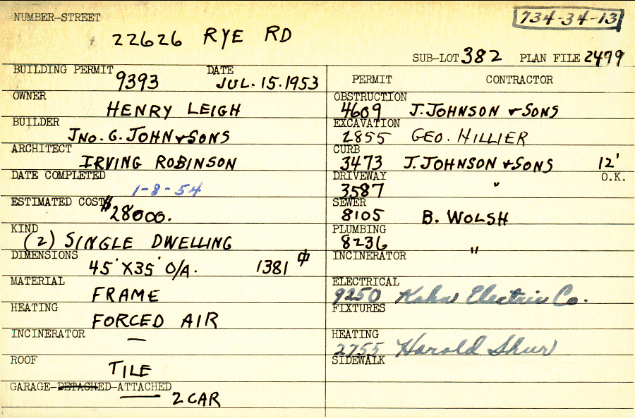 22626 Rye Road Shaker Heights, OH 44122 PARCEL ID: 734-34-013 Building Permit Date: 07-15-1953 Plan File Number: 2479, 6643 all scanned Microfilm Roll: Roll035, Roll087 Neighborhood: Mercer Owner: Leigh, Henry Builder: John G. John and Sons Architect: Robinson, Irving Estimated Cost: 28000 Date Completed: 01-08-1954 Kind: Single, Single Residence or Dwelling (2) Material: Frame Heating: Forced Air Roof: Tile Garage: attached 2 car Blueprints: online, see link above |
