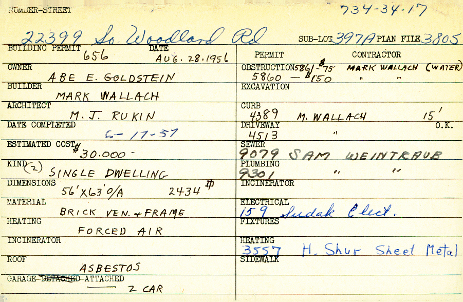 22399 South Woodland Road Shaker Heights, OH 44122 PARCEL ID: 734-34-017 Building Permit Date: 08-28-1956 Plan File Number: 3805 Microfilm Roll: Roll#56 Neighborhood: Mercer Owner: Goldstein, Abe E. Builder: Wallach, Mark Architect: Rukin, M. J. Estimated Cost: 30000 Date Completed: 06-17-1957 Kind: Single, Single Residence or Dwelling (2) Material: Brick Veneer and Frame Heating: Forced Air Roof: Asbestos Garage: attached 2 car |