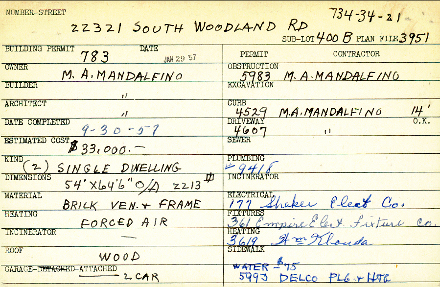 22321 South Woodland Road Shaker Heights, OH 44122 PARCEL ID: 734-34-021 Building Permit Date: 01-29-1957 Plan File Number: 3951 Microfilm Roll: Roll#58 Neighborhood: Mercer Owner: Mandalfino, M. A. Builder: Mandalfino, M. A. Architect: Mandalfino, M. A. Estimated Cost: 33000 Date Completed: 09-30-1957 Kind: Single, Single Residence or Dwelling (2) Material: Brick Veneer and Frame Heating: Forced Air Roof: Wood Garage: attached 2 car |