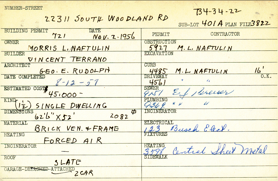22311 South Woodland Road Shaker Heights, OH 44122 PARCEL ID: 734-34-022 Building Permit Date: 11-02-1956 Plan File Number: 3822 Microfilm Roll: Roll#56 Neighborhood: Mercer Owner: Naftulin, Morris L. Builder: Terrano, Vincent Architect: Rudolph, George E. Estimated Cost: 45000 Date Completed: 08-12-1957 Kind: Single, Single Residence or Dwelling Material: Brick Veneer and Frame Heating: Forced Air Roof: Slate Garage: attached 2 car |