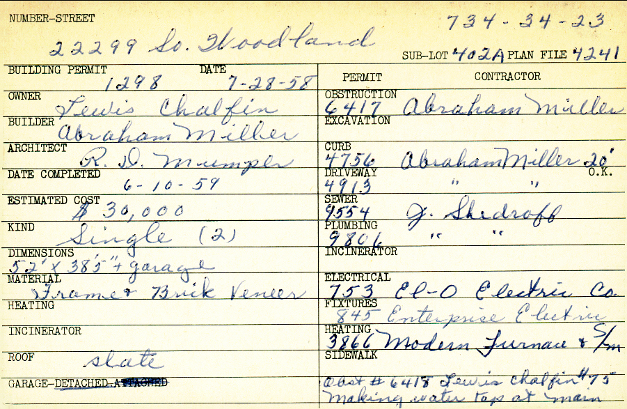 22299 South Woodland Road Shaker Heights, OH 44122 PARCEL ID: 734-34-023 Building Permit Date: 07-28-1958 Plan File Number: 4241 Microfilm Roll: Roll#61 Neighborhood: Mercer Owner: Chalfin, Lewis Builder: Miller, Abraham Architect: Mumper, R. D. Estimated Cost: 30000 Date Completed: 06-10-1959 Kind: Single, Single Residence or Dwelling (2) Material: Frame and Brick Veneer Roof: Slate Garage: detached |