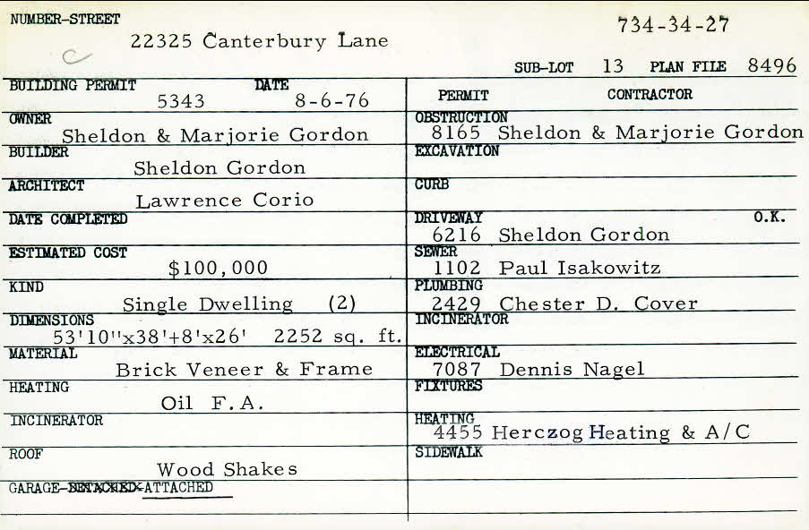 22325 Canterbury Lane Shaker Heights, OH 44122 PARCEL ID: 734-34-027 Building Permit Date: 08-06-1976 Plan File Number: 8496 Microfilm Roll: Roll#97 Neighborhood: Mercer Owner: Gordon, Sheldon and Marjorie Builder: Gordon, Sheldon Architect: Corio, Lawrence Estimated Cost: 100000 Kind: Single, Single Residence or Dwelling (2) Material: Brick Veneer and Frame Heating: Forced Air Roof: Wood Shakes Garage: attached |