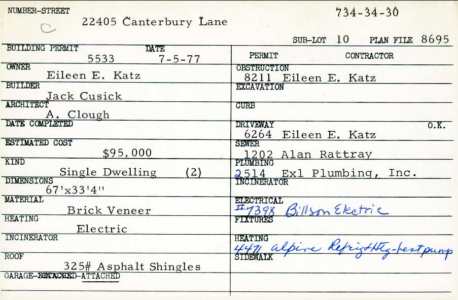 22405 Canterbury Lane Shaker Heights, OH 44122 PARCEL ID: 734-34-030 Building Permit Date: 07-05-1977 Plan File Number: 8695 Microfilm Roll: Roll#98 Neighborhood: Mercer Owner: Katz, Eileen E. Builder: Cusick, Jack Architect: Clough, A. Estimated Cost: 95000 Kind: Single, Single Residence or Dwelling (2) Material: Brick Veneer Roof: 325# Asphalt Garage: attached |